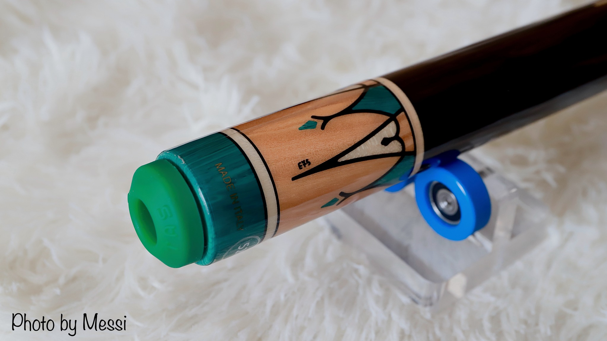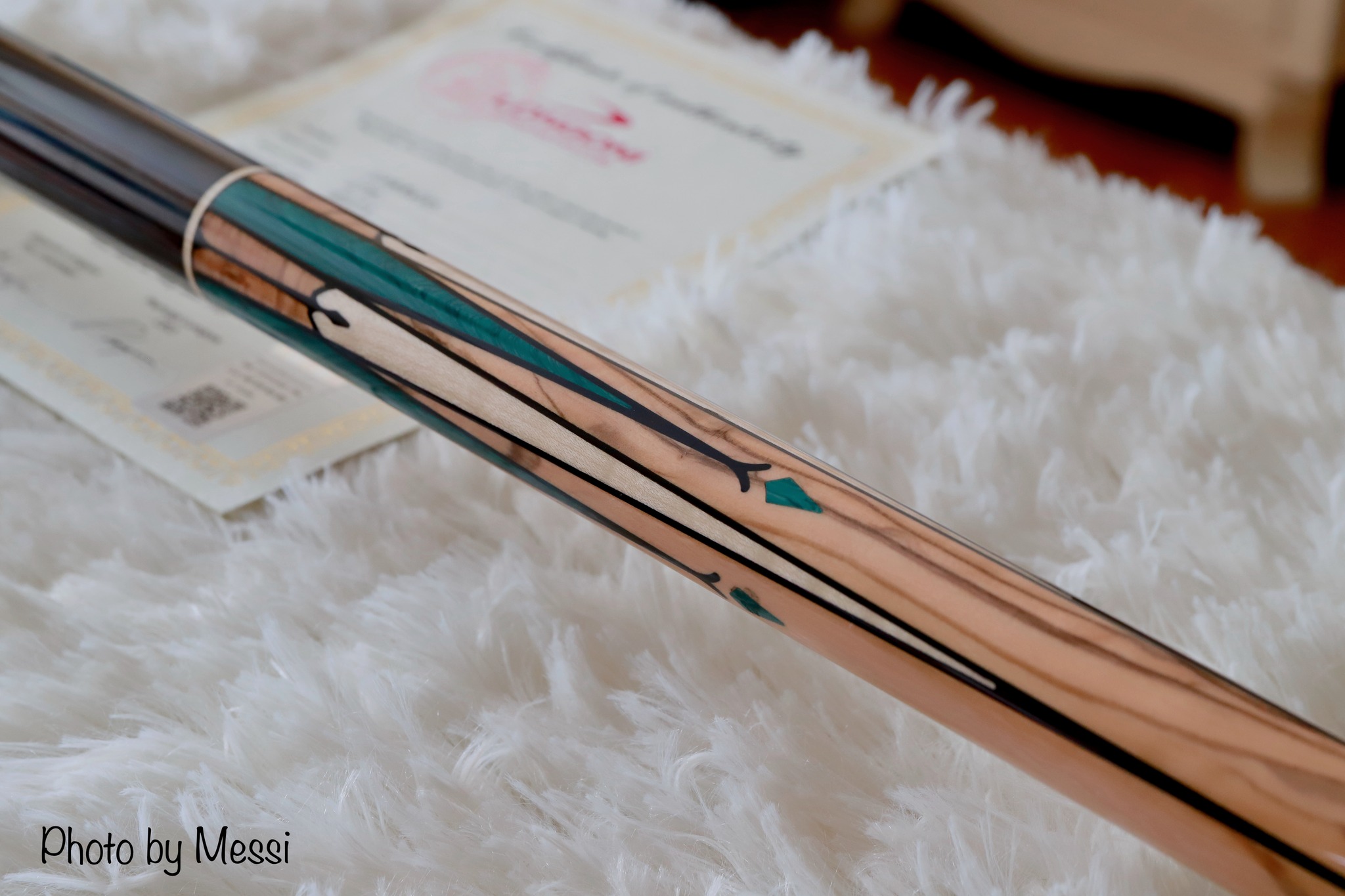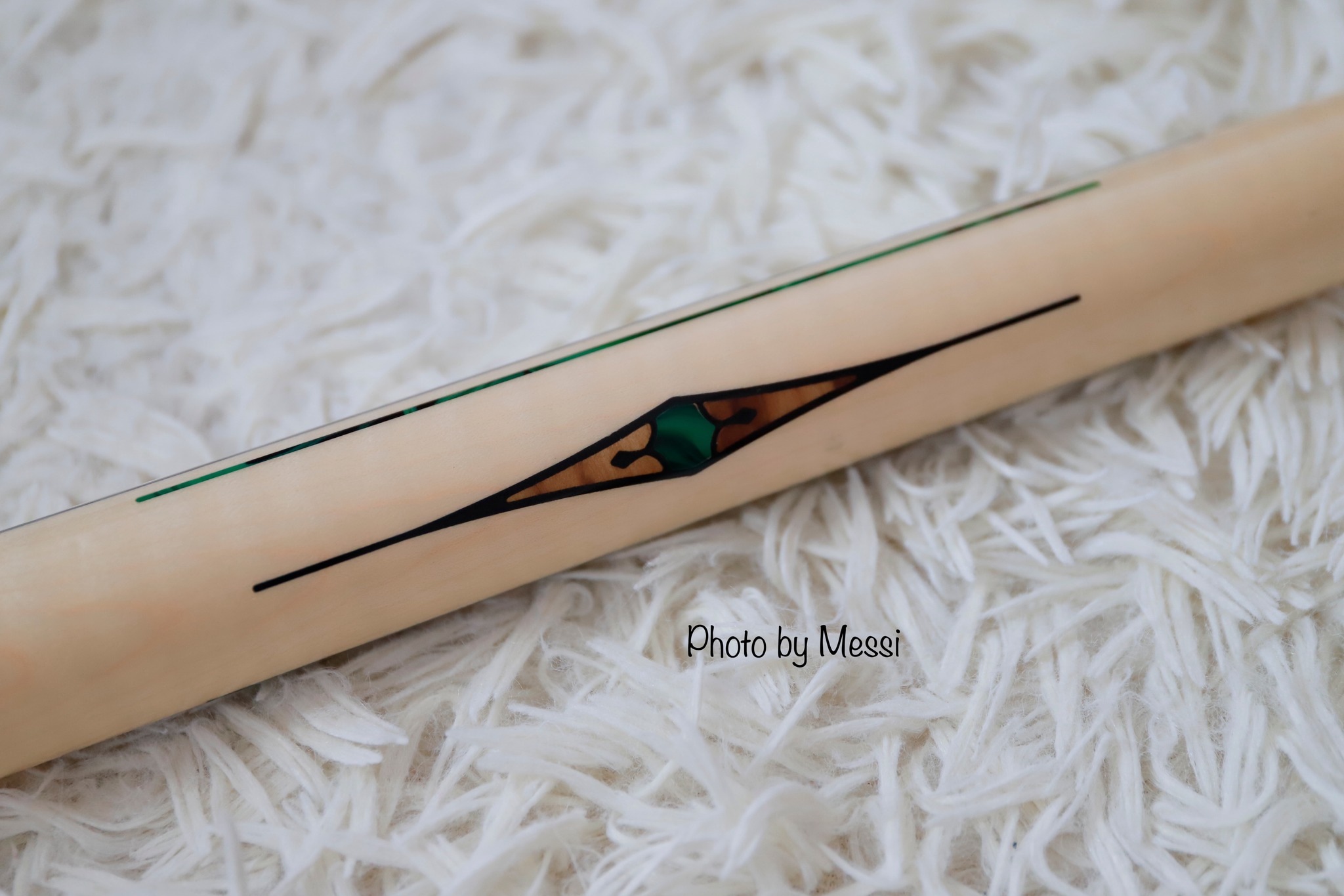 Phần đế và khoen nối xanh trên Black là vật liệu Epoxy, còn trên White là gỗ Curly map. Các chi tiết cẩn ghép còn lại màu xanh lá kết hợp trên nền gỗ Olive có sớ rất đẹp.